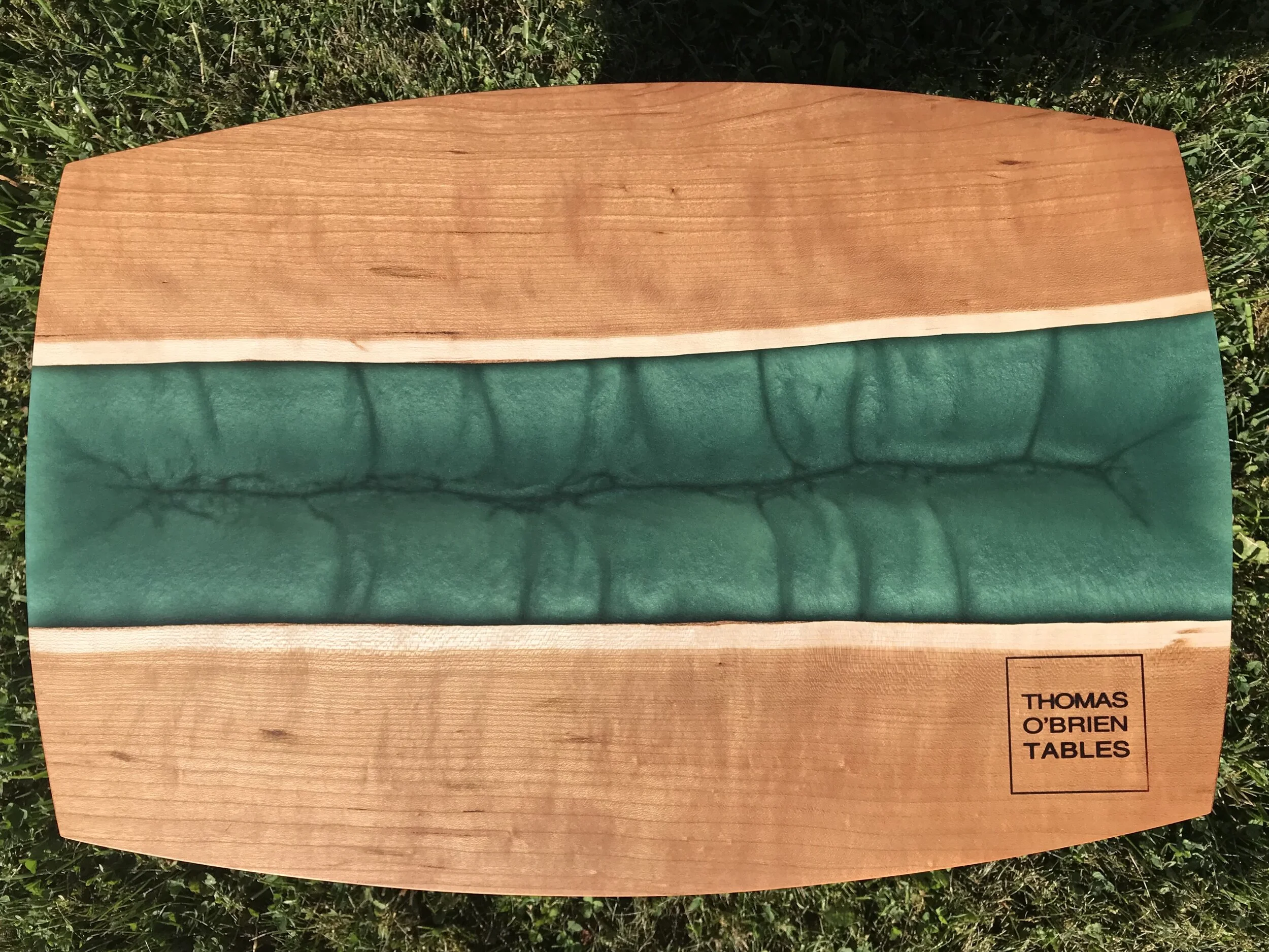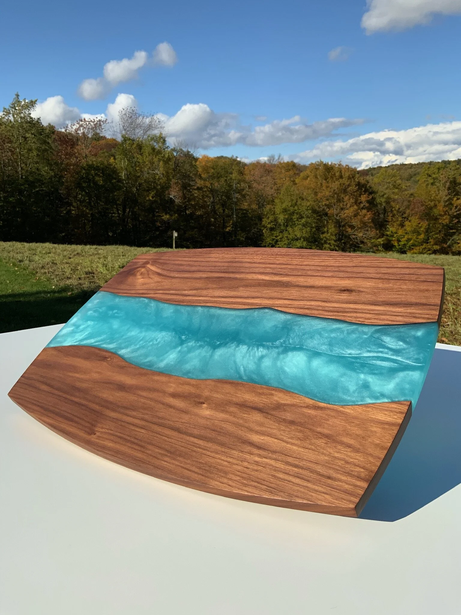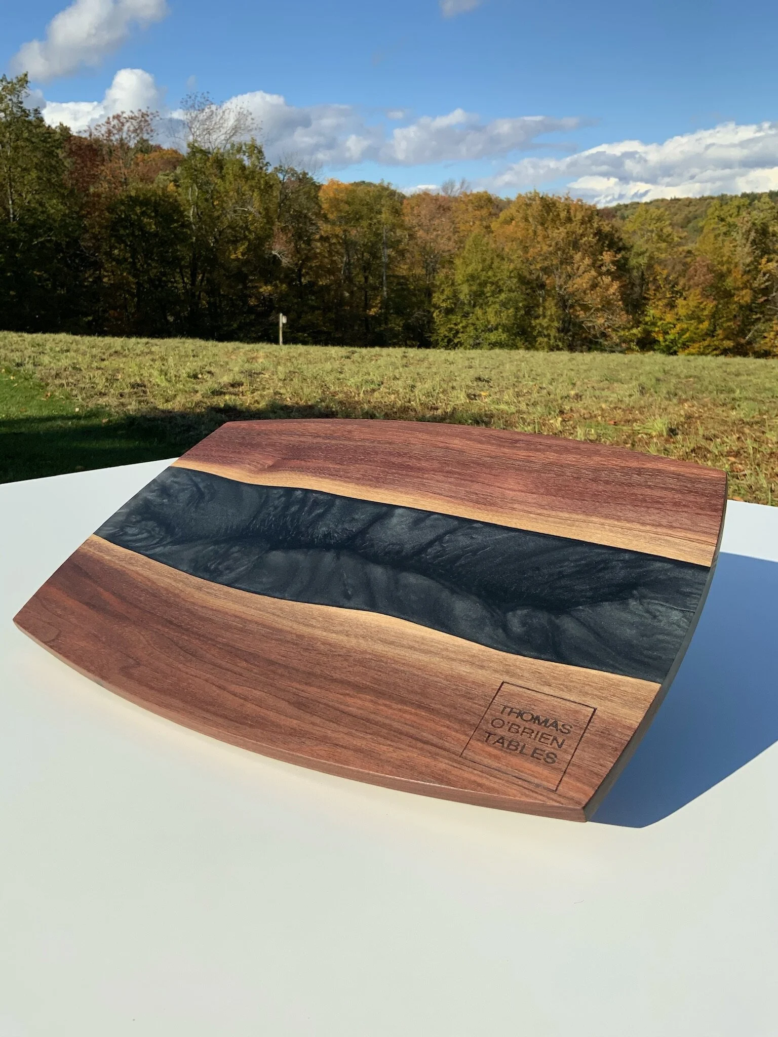 A beautiful charcuterie serving board crafted from locally sourced hardwoods with a custom epoxy inlay. Choose from black walnut (shown), maple or cherry. The eco-friendly epoxy can be tinted in an almost unlimited choice of colors. The sample shown has my logo on the front, but on yours it will be discretely branded on the bottom.